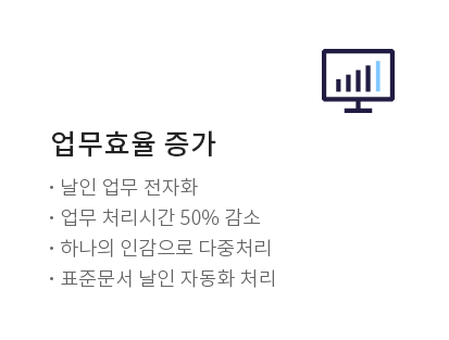전자인장관리솔루션 도입으로 날인업무(출력-날인-스캔)를 전자화함으로써 비용과 시간을 절약하여 업무의 효율성을 증대시킵니다.
